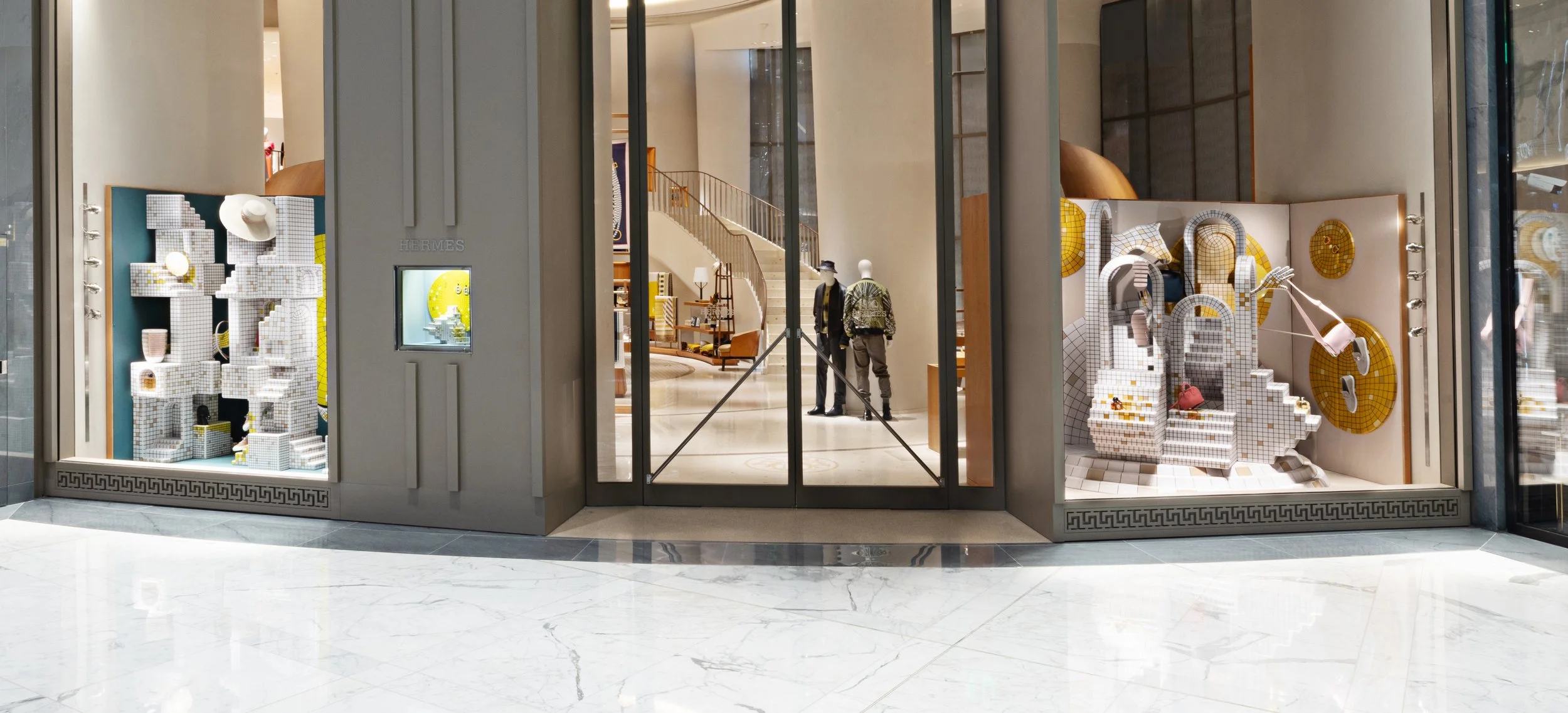 The window display concept draws inspiration from the iconic Hermès boutique on Rue du Faubourg Saint-Honoré, where the entire space, from the floors to the staircases, evokes the illusion of a surrealist maze. The intricate mosaic tile flooring becomes a central motif, its geometric patterns guiding the eye through a labyrinth of creativity.